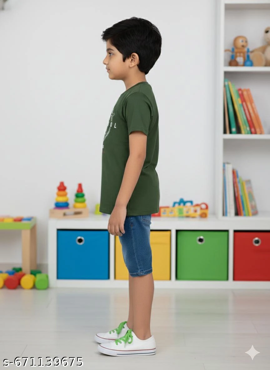 Elevate your young explorer’s everyday wardrobe with this Kids Boys Olive Green Graphic Print T-Shirt. Crafted from 100% premium breathable cotton, this tee ensures all-day coolness and comfort, whether he's at a playdate or a family outing. The rich olive green hue provides a sophisticated yet versatile base, while the bold "NEW COOL" circular graphic adds an edgy, contemporary vibe.