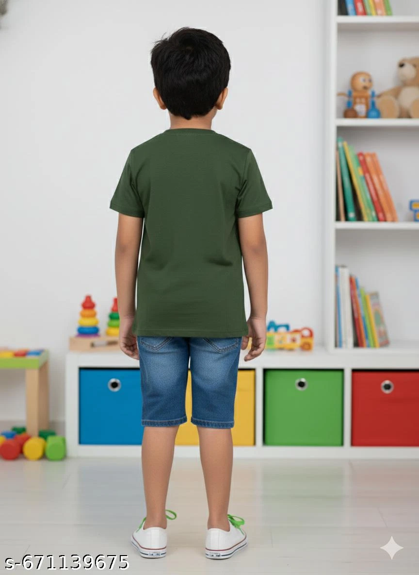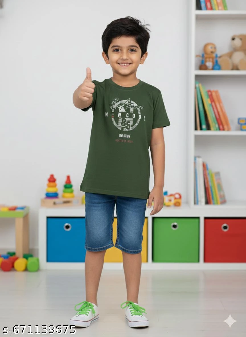 Elevate your young explorer’s everyday wardrobe with this Kids Boys Olive Green Graphic Print T-Shirt. Crafted from 100% premium breathable cotton, this tee ensures all-day coolness and comfort, whether he's at a playdate or a family outing. The rich olive green hue provides a sophisticated yet versatile base, while the bold "NEW COOL" circular graphic adds an edgy, contemporary vibe.